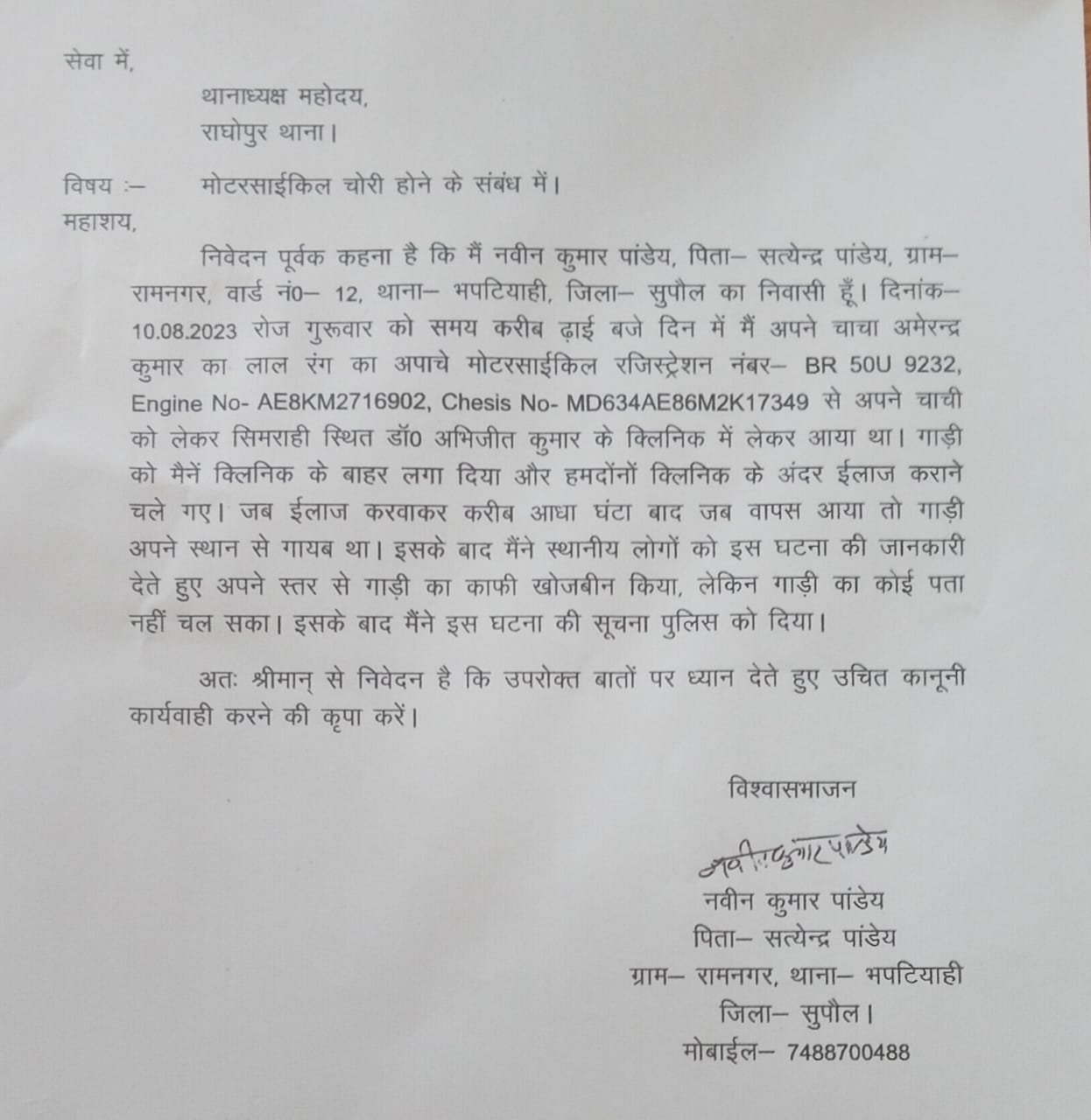 थाना में दिए गए आवेदन में सरायगढ़ भपटियाही थाना क्षेत्र के रामनगर वार्ड 12 निवासी नवीन कुमार पांडेय ने कहा कि गुरुवार को वह अपने चाचा अमरेन्द्र कुमार के एक बाइक बीआर 50 यू 9232 को लेकर अपनी चाची के साथ ईलाज के लिए सिमराही बाजार के करजाइन रोड स्थित एक निजी क्लिनिक पर गया था। इसी क्रम में वह क्लिनिक के बाहर गाड़ी खड़ी कर अंदर गए। वापस लौटने पर बाइक गायब मिला। काफी खोजबीन के बाद भी बाइक का कुछ पता नहीं चल सका।