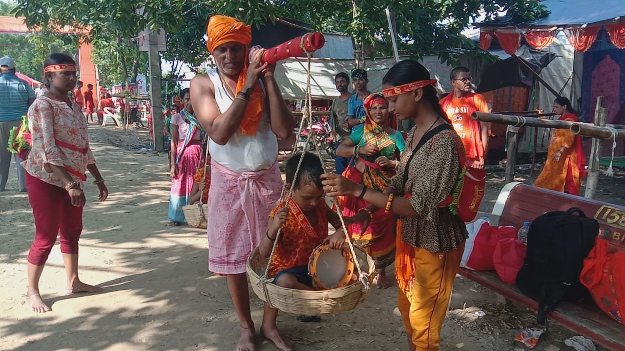शिव भक्तों कांवड़ियों का मनोकामना पूर्ण होने पर अपने पुत्र पुत्री को कांवड़ में बैठा कर चले बाबा भोलेनाथ को जलाभिषेक करने, बताते चलें कि मुंगेर जिला के खडकपुर टेटिया बंबर के मिल्की गंगटा निवासी दयाशंकर सिंह ने बताया 10 साल पूर्व अजगैबीनाथ धाम उत्तरवाहिनी गंगा घाट से जल लेकर बाबा बैजनाथ धाम में पुत्र के लिए मन्नत मांगे थे। बाबा भोलेनाथ मेरे मनोकामनाएं पूर्ण होने से हम सभी परिवार, सहित एक पुत्र और एक पुत्री को कांवड़उउ में बैठा बाबा भोलेनाथ बैधनाथ धाम पैदल यात्रा कर बाबा भोलेनाथ को जल चढाएंगे। साथ ही दयाशंकर सिंह ने कहा, बाबा भोलेनाथ सभी का सुनते है। वहीं बच्चे के माता निशा देवी ने बताया कि बाबा भोलेनाथ हमारी मनोकामनाएं पूर्ण करने पर बच्चों को कांवर मे लेकर बाबा भोलेनाथ को जल चढाएंगे। साथ ही रेलवे विभाग के चंदेश्वर राय कांवडिया दरभंगा जिला के जे.पी. चौक के रहनेवाले ने बताया कि मन मे इच्छा जगा तो मैं अपने बच्चों को कांवर में लेकर सपरिवार अजगैबीनाथ धाम से पैदल बैधनाथ धाम के लिये पैदल बाबा भोलेनाथ को जल.चढाने जा रहे।जो हमारे पुत्र संकक्षम कुमार एंव पुत्री सरवेक्षा कुमारी को कांवर मे लेकर.देवघर जा रहे हैं।बच्चे के माता खुशबू कुमारी ने बताया कि हमारे पांच बच्चे हैं।भरत राय धन्नु राय,सकक्षम राय,साक्षी कुमारी,सरवेक्षा कुमारी हैं।हमारे बहन सुनीता देवी हैं।जो हमारे पति चंदेश्वर राय के साथ मिलकर कांवर मे अपने दो बच्चों के साथ सपरिवार देवघर बैधनाथ धाम जा रहे है।बाबा भोलेनाथ हम सबो कि मनोकामनाएं पूर्ण करते हैं।इस लिये सपरिवार देवघर बैधनाथ. धाम जाते रहते हैं।