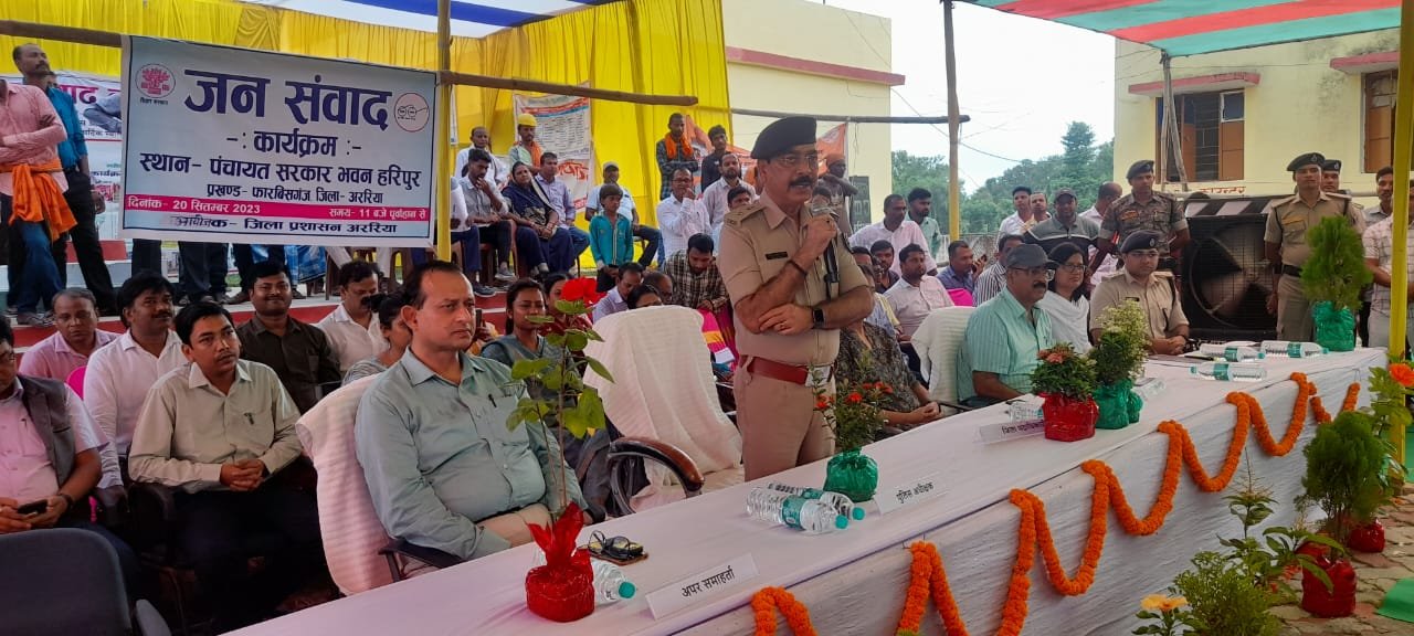 अररिया : जिला पदाधिकारी, अररिया के दिशा निर्देश के आलोक में विभिन्न लोक कल्याणकारी योजनाओं के क्रियान्वयन की जानकारी आम जनों को सुलभ कराने, उनकी प्रतिक्रिया प्राप्त करने तथा जन समस्याओं की जमीनी जानकारी एवं निदान के लिए पंचायतों में जन संवाद कार्यक्रम का आयोजन किया जा रहा है। इसी कड़ी में आज फारबिसगंज प्रखंड अन्तर्गत हरिपुर, पंचायत सरकार भवन में जिला पदाधिकारी श्रीमती इनायत खान, पुलिस अधीक्षक श्री अशोक कुमार सिंह एवं उपस्थित माननीय पंचायती राज के जनप्रतिनिधी सहित जिला स्तरीय वरीय पदाधिकारी द्वारा संयुक्त रूप से दीप-प्रज्वलित कर जन संवाद कार्यक्रम का उद्घाटन किया गया। कार्यक्रम की शुरुआत स्थानीय स्कूली बच्चों के द्वारा स्वागतगान से किया गया। सर्वप्रथम कार्यक्रम को संबोधित करते हुए जिलाधिकारी श्रीमती इनायत खान ने कहा कि यह जन संवाद कार्यक्रम समस्या और समाधान, आम जनता तथा प्रशासन के बीच सेतु का काम कर रहा है। जनसंवाद का मकसद योजनाओं की जानकारी उसके क्रियान्वयन और आम आदमी तक इसका लाभ पहुंचाना है। कई योजनाओं की जानकारी बेहद जरूरी है। इसे कैसे लागू किया जाए यह जानना भी आवश्यक है। जिलाधिकारी ने कहा कि आप सभी के साथ संवाद स्थापित करना, सुझाव प्राप्त करना, समस्याओं का समाधान करना ही इसका मुख्य मकसद है। उन्होंने कहा कि हर योजनाओं की जानकारी हर लोगों को नहीं है। इस दौरान जिलाधिकारी द्वारा लोगों से संवाद भी किया। कार्यक्रम को संबोधित करते हुए पुलिस अधीक्षक श्री अशोक कुमार सिंह द्वारा साईबर क्राईम तथा महिला हेल्पलाइन की विस्तृत जानकारी से आम जनों को अवगत कराया। वहीं कार्यक्रम को उप विकास आयुक्त श्री संजय कुमार, अपर समाहर्ता श्री राजमोहन झा, अनुमंडल पदाधिकारी, फारबिसगंज, अनुमंडल पुलिस पदाधिकारी फारबिसगंज, जिला परिवहन पदाधिकारी अररिया सहित माननीय जनप्रतिनिधि, जिला स्तरीय वरीय पदाधिकारी गण ने भी संबोधित किया। जन संवाद कार्यक्रम में सिविल सर्जन अररिया द्वारा उपस्थिति लोगों को स्वास्थ्य सेवाओं से जुड़ी विस्तृत जानकारी देते हुए कहा कि जिले के सभी प्राथमिक स्वास्थ्य केन्द्रों, अनुमण्डल अस्पतालों और जिला अस्पताल में सभी प्रकार आवश्यक चिकित्सकीय सुविधा उपलब्ध है।