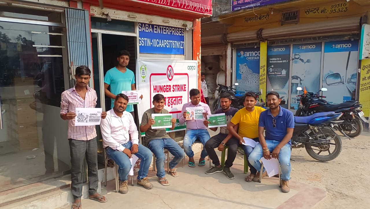 वहीं सिमराही के ओप्पो डिस्ट्रीब्यूटर कार्यालय के बाहर मोबाइल दुकानदारों ने भूख हड़ताल पर बैठ कर प्रदर्शन किया