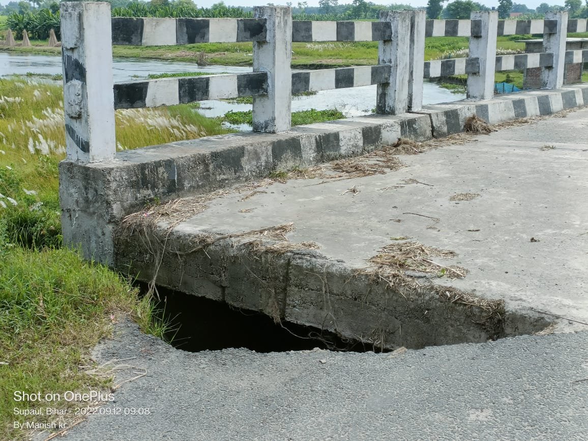 जिस वजह से सड़क भी क्षतिग्रस्त हो रहा है।वही पुल के पास बड़ा रेन कट लग जाने से पूल के समीप एक बड़ा गड्ढा बन गया है।जो हर हमेशा आने जाने वाले लोगो के लिए खतरा बना हुआ है।लेकिन विभाग संवेदक के द्वारा अभी तक अप्रोच पथ का मरम्मत नही कराया गया है।।ईधर जब संबंधित समश्या को लेकर त्रिवेणीगंज ग्रामीण कार्य विभाग के जे.ई ने अवधेश प्रसाद से जानने की कोशिश की गई तो उन्होंने फोन नही उठाया।