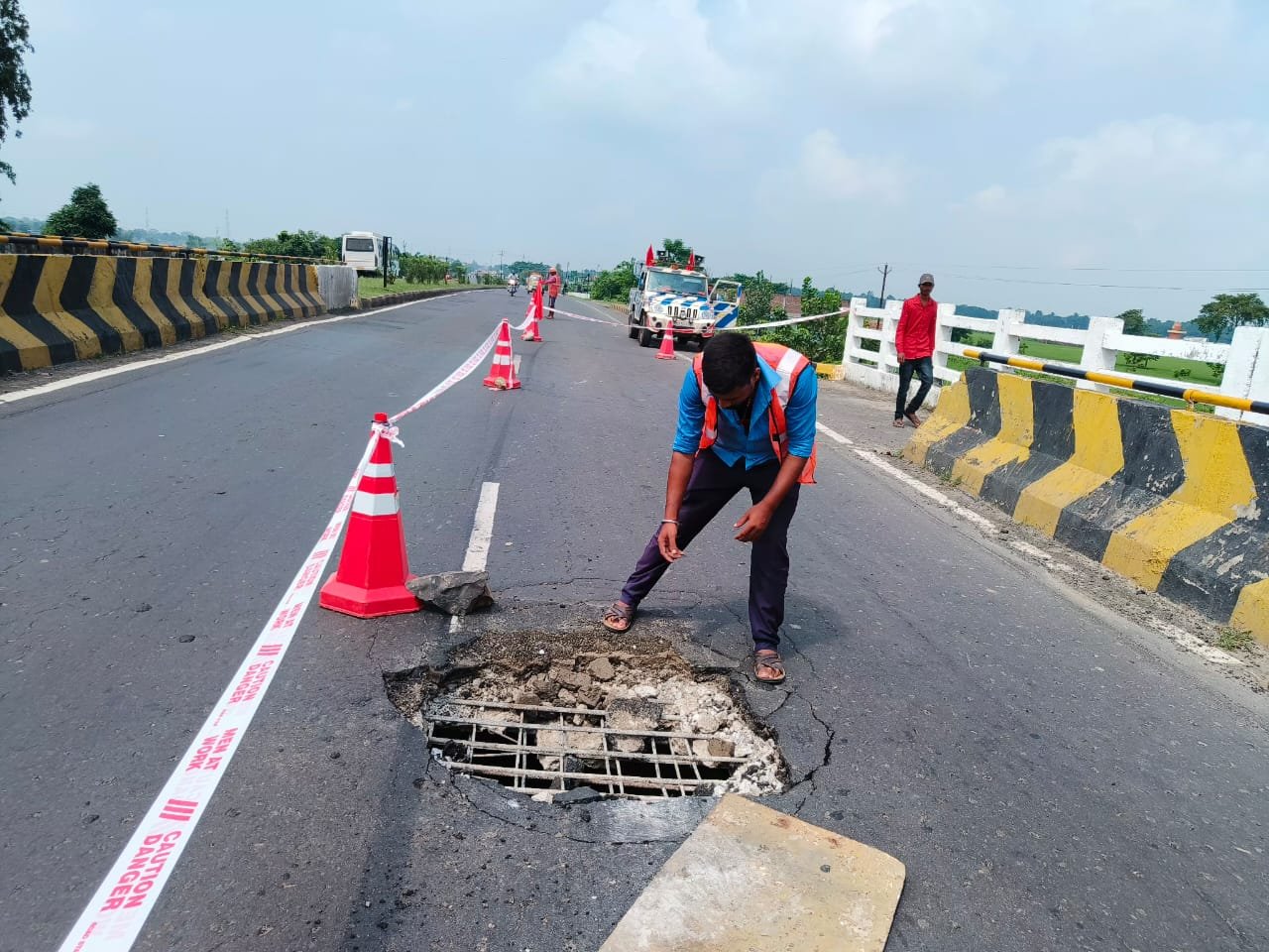 सिमराही राष्ट्रीय राजमार्ग का पूल ढलाई क्षतिग्रस्त, एनएच के नीचे का नदी दिखाई पड़ रहा है।